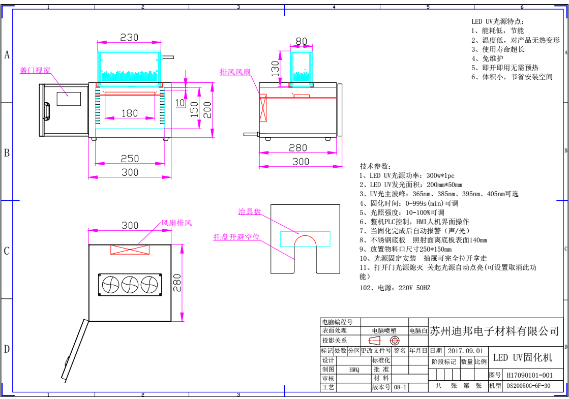 本UVLED固化炉外形设计小巧精致,轻便简洁。主要运用于UV胶水本固化、UV老化实验及同一治具多个产品的UV固化,可选择365nm、385nm、395nm、405nm等不同波长,发光面积可根据实际固化面积选择;不同功率的LED对应固化涂覆在不同材质上的UV胶水、UV油墨、UV光油、UV油漆等。UVLED固化炉无需预热可即开即亮,高纯度照射,没有热辐射和深度紫外光,使用寿命长,为您减少设备耗材成本,同比汞灯能耗低,不含汞物质,是一款节能环保的新型UV固化设备,让您产品的UV固化更快速。